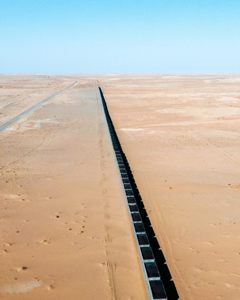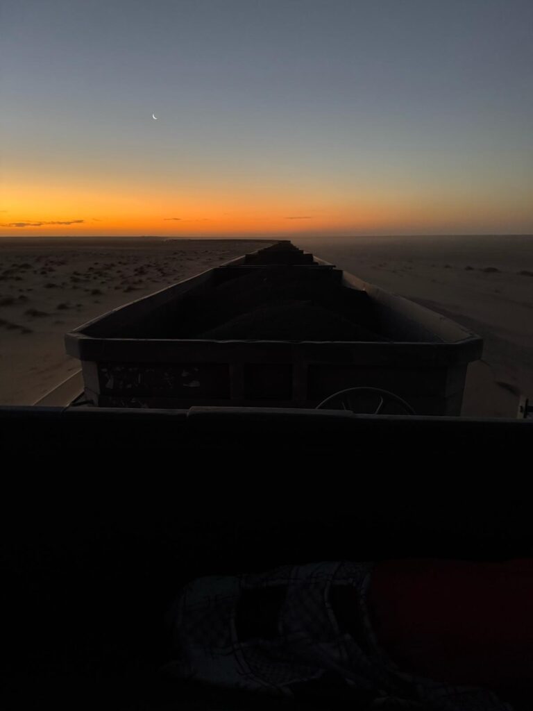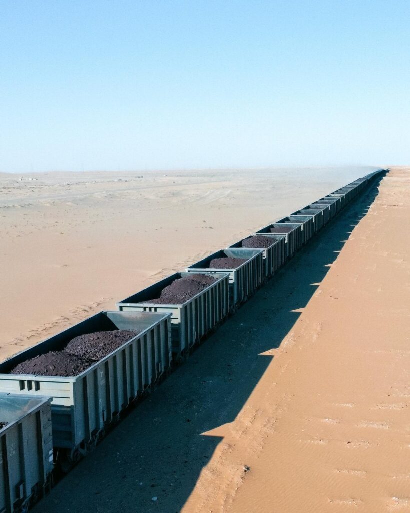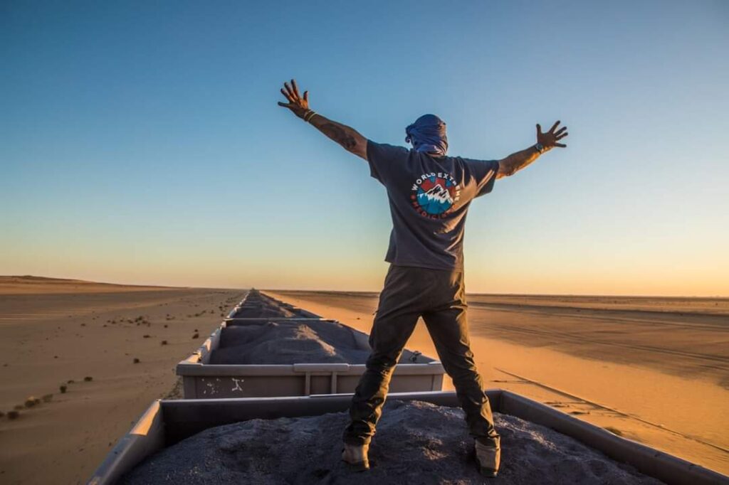 This Train of the desert is the longest in the world with 200 cars over a length of 2 km , the heaviest with its 20000 tons and the slower with 15-18 hours of travel for a distance of 650 km there are three trains par day.
